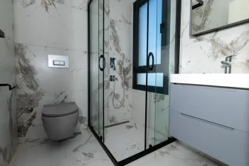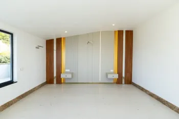 Upstairs again, the second floor is home to the master bedroom. This impressive room has its own walk-in closet and en-suite private bathroom. Doors open to a panoramic terrace with views heading out towards the distant sea and surroundings.