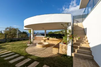Situated within a private plot of land, the villa exits to a beautifully landscaped tiered garden. Directly from the lounge, the swimming pool is available for cooling down or sunbathing besides. Steps lead down to the lower garden featuring lots of grass and room for barbecues or socialising. Parking is available for several vehicles.