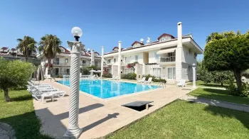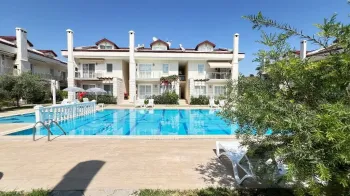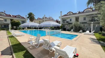 This ground floor apartment is for sale within the residential area of Calis in Fethiye and forms part of an excellent complex with huge swimming pool and green landscaped gardens for residents to relax outside.