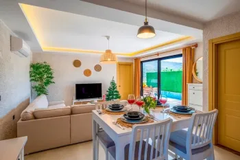Ready to move in immediately is this charming villa for sale in Ovacik area of Fethiye, forming part of a residential complex with facilities including a shared swimming pool and landscaped gardens for relaxing outside all year round.