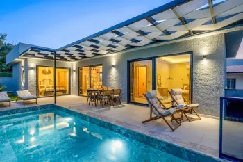 The villa offers 200m2 internal living space and enters into a large living room with offset dining area and kitchen. Next to the kitchen is a fully equipped bathroom with bathtub, toilet, and washing machine. Sliding doors open from the lounge directly to the swimming pool and terrace.
