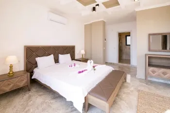 Upstairs again, the second floor of the house is home to two further bedrooms. One of the rooms is a twin suite room with sea view and en-suite bathroom attached. The second room is a double sized suite room with private bathroom and balcony looking out towards the sea and surroundings.