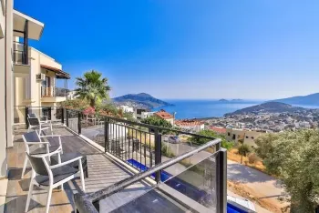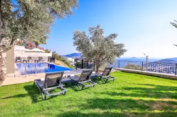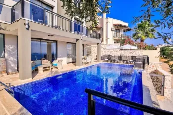 This outstanding property is for sale in the residential area of Ortaalan in Kalkan and enjoys panoramic views heading out towards the sea and surroundings from an infinity swimming pool and highly private garden.