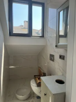 For sale here is a spacious duplex apartment located on the top and roof floor of the building. The property offers 135m2 internal living space and is a reverse duplex with living room and kitchen on the roof floor and bedrooms on the lower floor. Doors open from the lounge to a roof terrace with views of the surroundings – out towards the sea and Fenerbahce stadium. Completing this floor is a fully equipped bathroom.