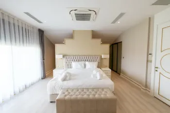 The second floor hosts large bedrooms and a sauna area designed for total relaxation and comfort. The top floor attic level includes a luxurious master bedroom with access to a terrace and a jacuzzi area, offering additional privacy and scenic views of the natural surroundings of Belek.