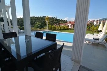Ready to move in immediately is this charming villa for sale in Ovacik area of Fethiye, forming part of a residential complex with facilities including a shared swimming pool and landscaped gardens for relaxing outside all year round.