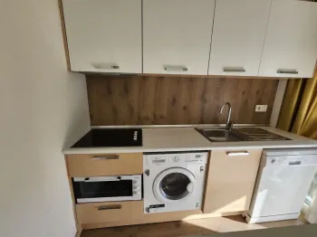 The apartment has a large spacious balcony with peaceful view out towards the surrounding areas and gardens below. Upon entering, an open plan layout consists of a kitchen and offset living room. The kitchen is equipped with lots of storage space and cooking worktops. The lounge is light and airy with windows allowing sunlight inside.