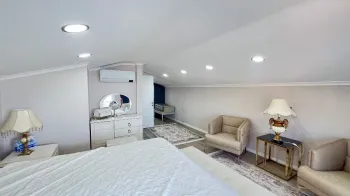 Stairs lead up to the attic floor of the duplex where two further bedrooms are located. Both rooms are double sized and have their own en-suite private bathrooms attached. The flat could sleep up to six people at any one moment. The master bedroom has access to a roof terrace with a beautiful view out towards the sea and the whole of Fethiye.