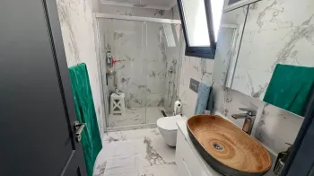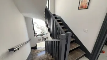 A staircase leads up to the first floor where an atrium balcony looks down across the kitchen and living room. A hallway leads through to two bedrooms. One of the bedrooms is a master room equipped with its own en-suite private bathroom. The second bedroom also has its own en-suite bathroom attached. Both of the rooms have their own balconies with sweeping views across the surroundings of Gocek.