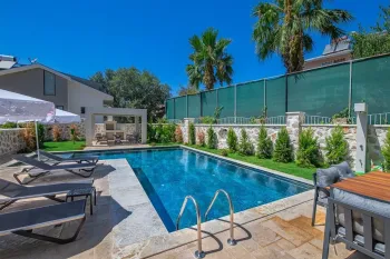 Within ten minutes to the nearest beach and seaside, this spacious villa is nestled in a highly private area of Ciftlik and has its own swimming pool and green landscaped garden for sitting and spending summer days outside.