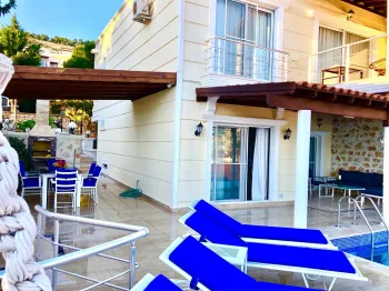Located on an authentic street within the sought after area of Kalamar Bay in Kalkan, this villa is surrounded by old pine trees and is just 200 metres, nothing more than a five minute walk, from the nearest beach for relaxing at the seaside. Nearby Kalamar Beach Club is ideal for water sport activities. Restaurants, shops, and public transportation can all be reached on foot.