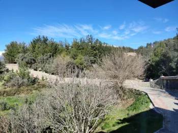 The villa offers 400m2 internal living space and enters into a large living room with relaxing stone-built fireplace. The kitchen is separate and equipped with a central island, storage cupboards, and lots of worktops. Off the kitchen is a dining area and bathroom. Doors open to a shaded terrace with views of the surrounding mountains.