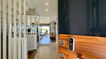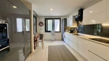 Built across three floors and constructed just four years ago, the villa offers 290m2 of internal living space and enters into an open plan area consisting of a lounge, kitchen, and dining area. Floor-to-ceiling windows fill the space with lots of natural light, while sliding doors open directly to the garden. There is a second living room located upstairs.