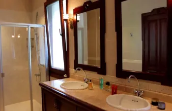 The main property has four double sized bedrooms and could sleep up to eight people at once. Three of the rooms have their own en-suite private bathrooms and showers attached. The main house also has a separate family bathroom and two WC bathrooms across the two floors.