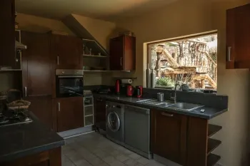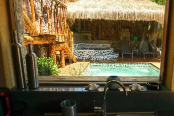The ground floor offers an open plan kitchen and living area designed for relaxed indoor-outdoor living. Upstairs, the property offers two spacious master bedrooms, each opening onto private balconies and terraces overlooking the garden and surrounding scenery. The house has one bathroom.