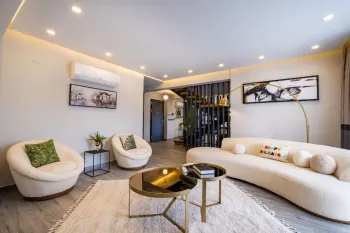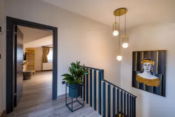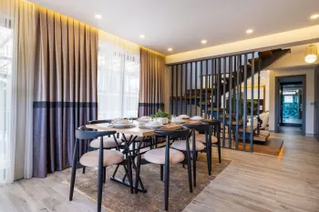 别墅入口处是一个带有大型开放式中庭的温馨走廊,然后进入带美式厨房的宽敞起居室。厨房设施齐全,配有品牌商品和大量储物空间。客厅的门通向带伸缩盖的露台。这一层还有一个卫生间。