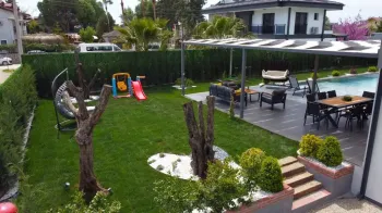 外部的私人花园安装了自动灌溉系统,易于维护。花园的中心是一个私人游泳池,配有用于冲洗的泳池淋浴设施。如果需要,花园的凉棚可以改建成泳池房或客房,并配有卫生间。花园可通过自动门进入,并可停放一辆汽车。